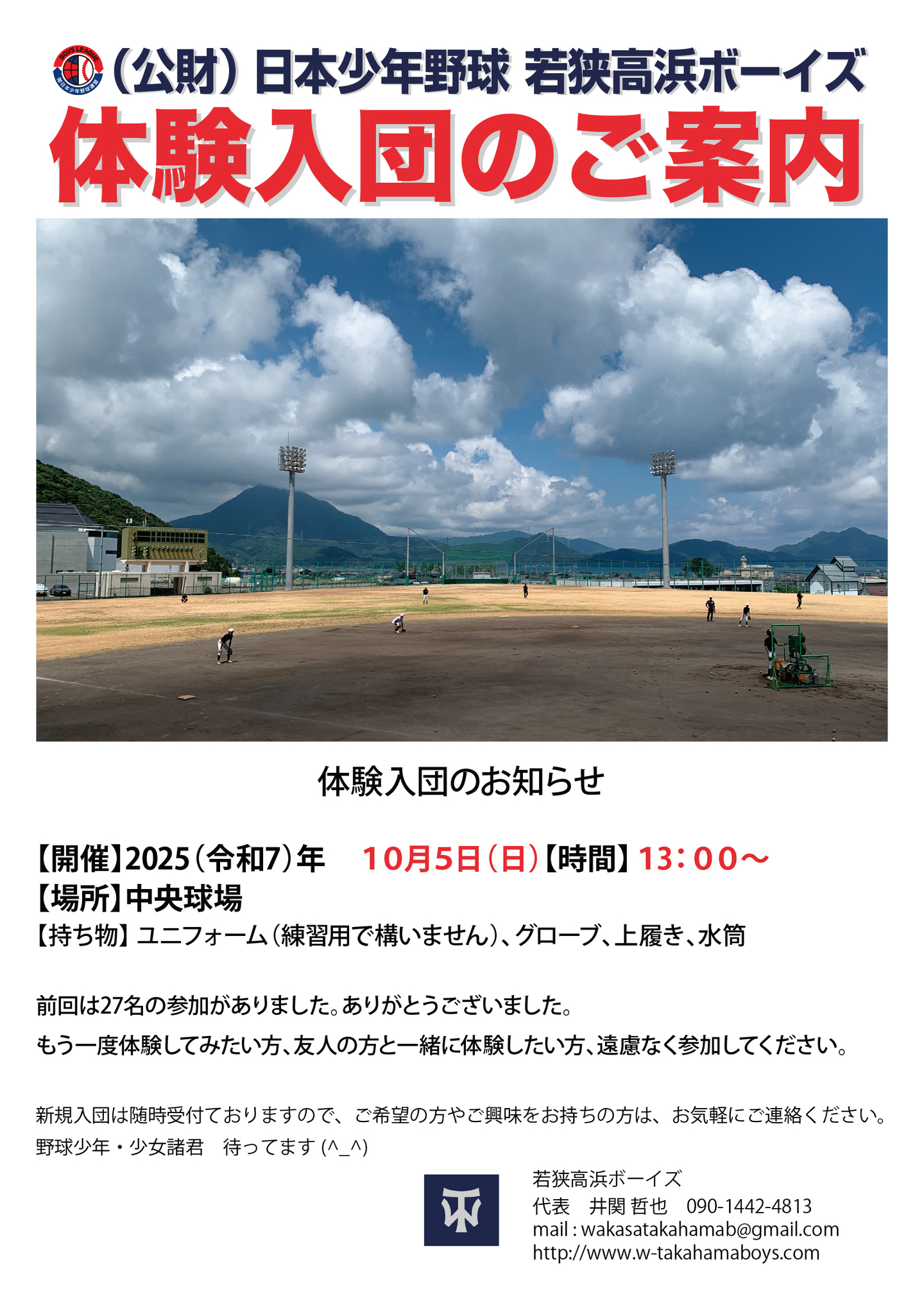 日頃は、若狭高浜ボーイズの活動に対しご理解とご協力を賜わり誠にありがとうございます。 野球少年・少女諸君 待ってます。